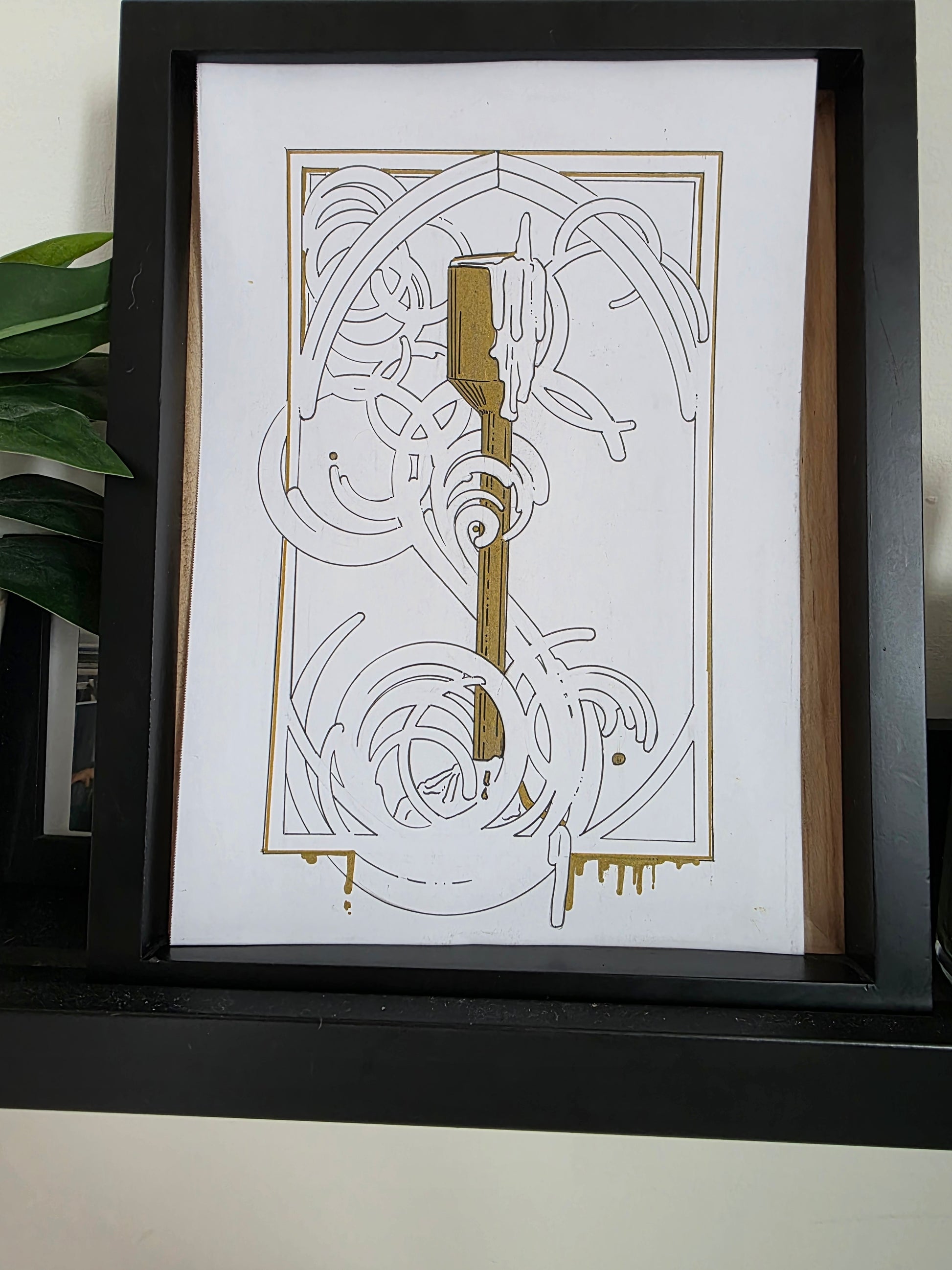 Once a candle burns out, its wax puddles and the wick dwindles until only smoke remains. In Burnout: Bathroom Cry (GOLD), smoke spirals in delicate curves, enveloping a GOLD candle holder that cradles the ghost of what was - a mind once luminous. The stark contrast of black and gold ink on white paper draws out the fragility and quiet hell of burnout.