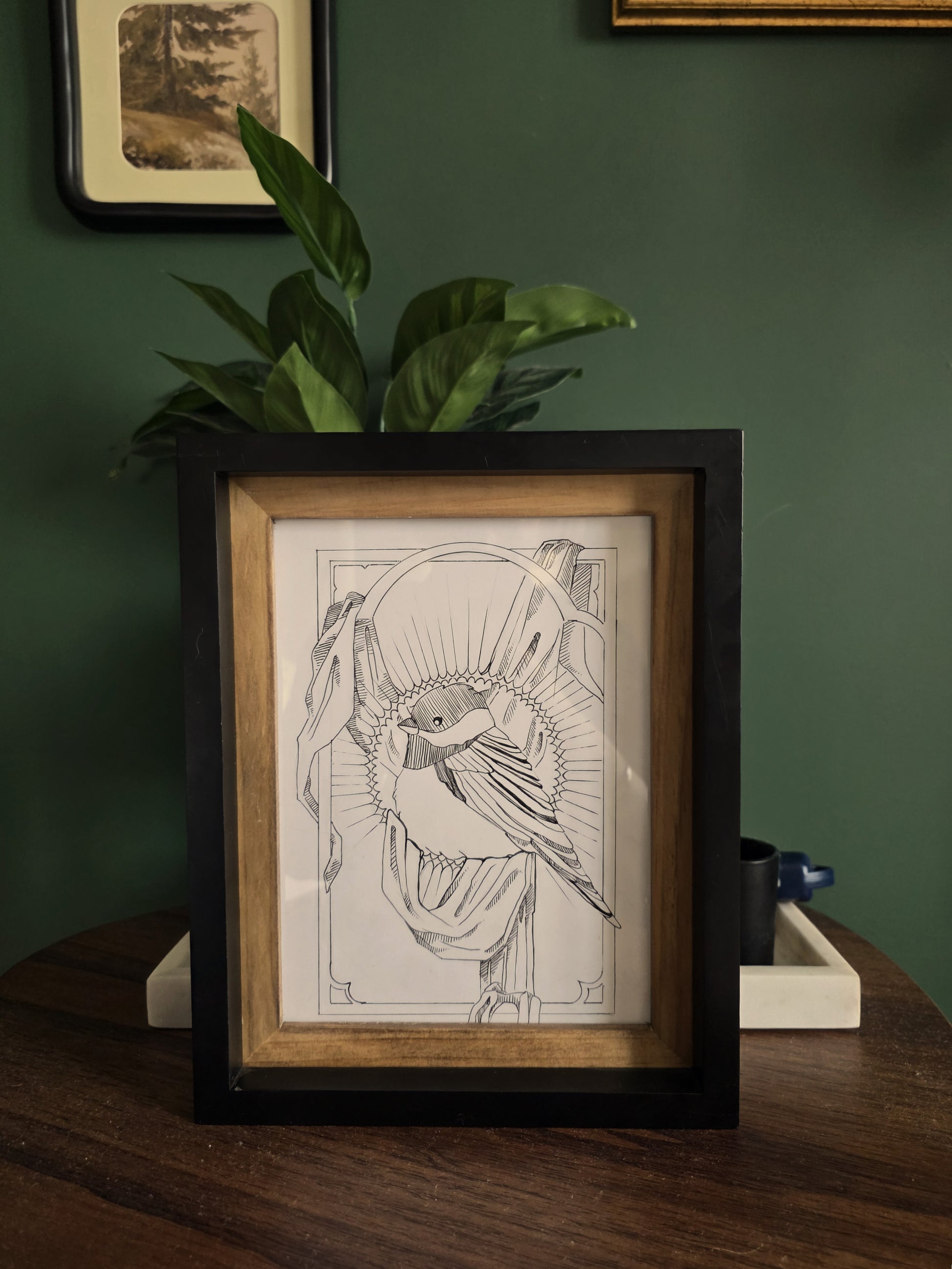 This gentle little chickadee is an homage to my home in the upper Midwest. I moved from my home-state of Minnesota to Washington D.C. for work (despite what my other art titles would indicate, things are going well). While the move has impacted my career for the best, it is lonely here. Therefor, here is a symbol of adaptability and resilience, - a chickadee.